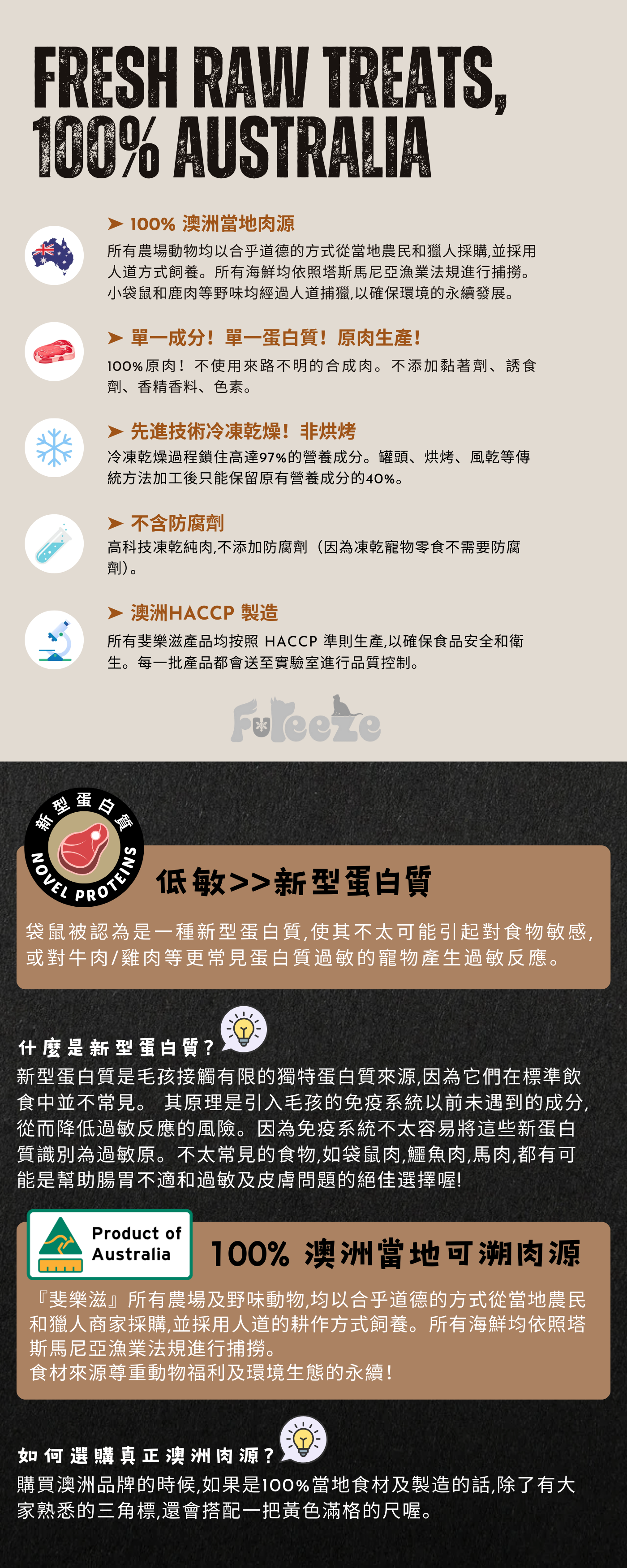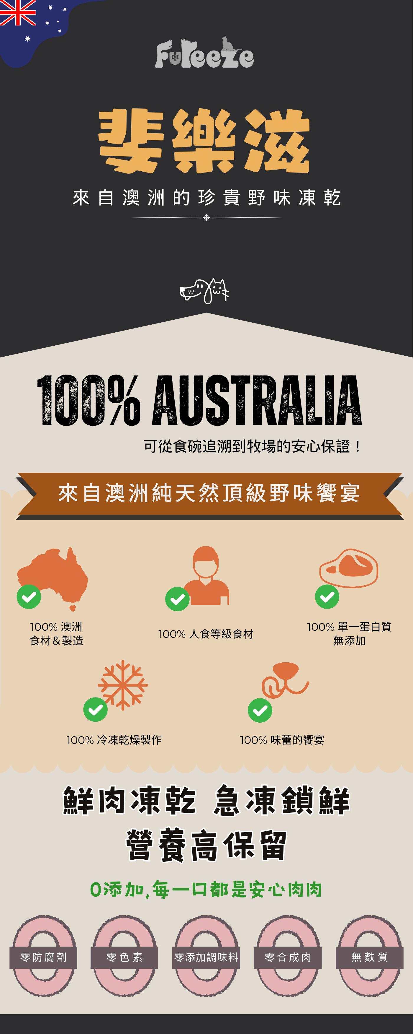 傳承澳洲大地的天然與精髓,採用先進的凍乾技術,保留營養,呈現給毛孩們健康、純淨的美味!