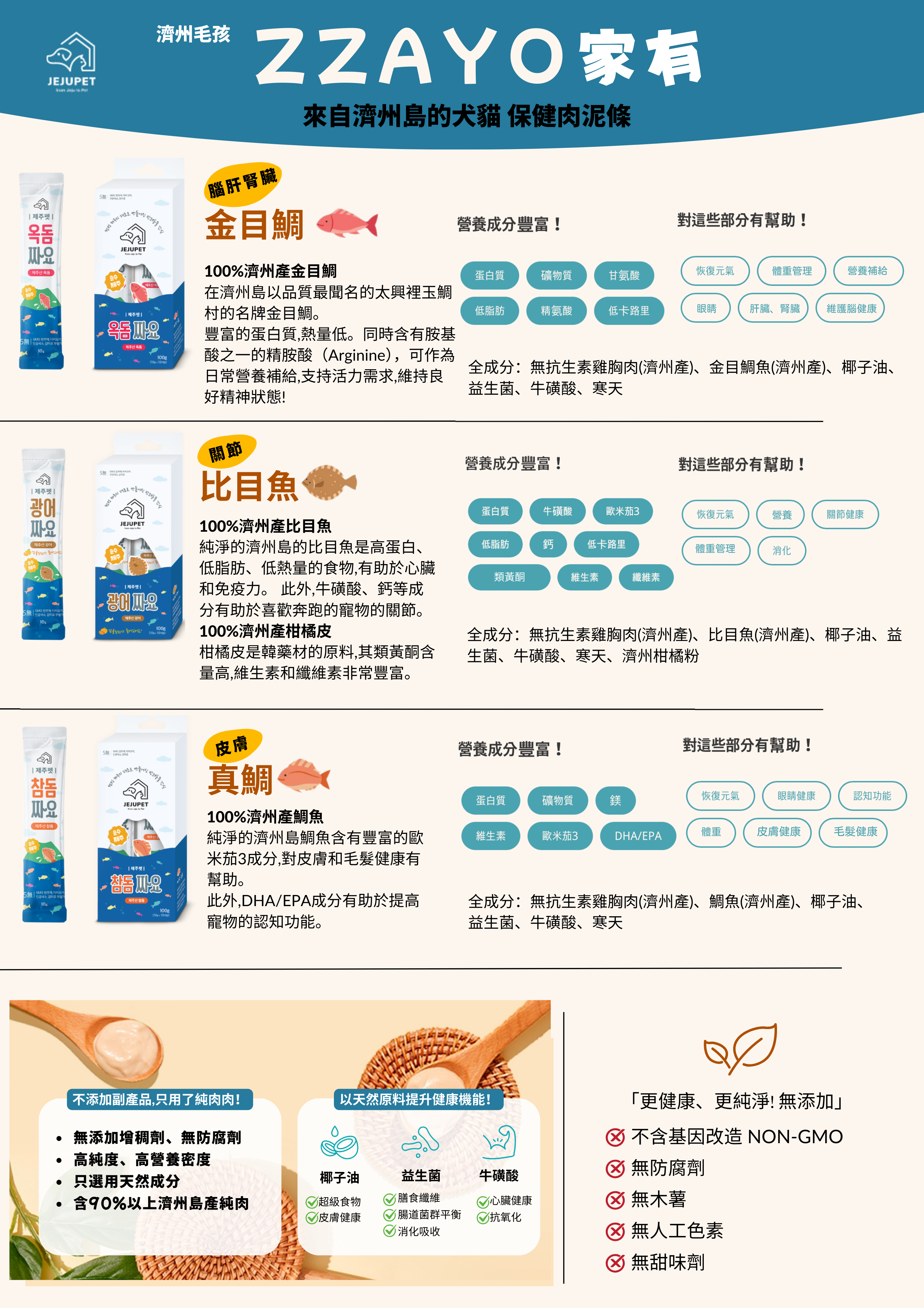 無抗生素雞胸肉(濟州產),比目魚(濟州產),椰子油,益生菌,牛磺酸,濟州柑橘皮粉,寒天 ※本產品不含人工色素與防腐劑、甜味劑、木著澱粉、增稠劑 |