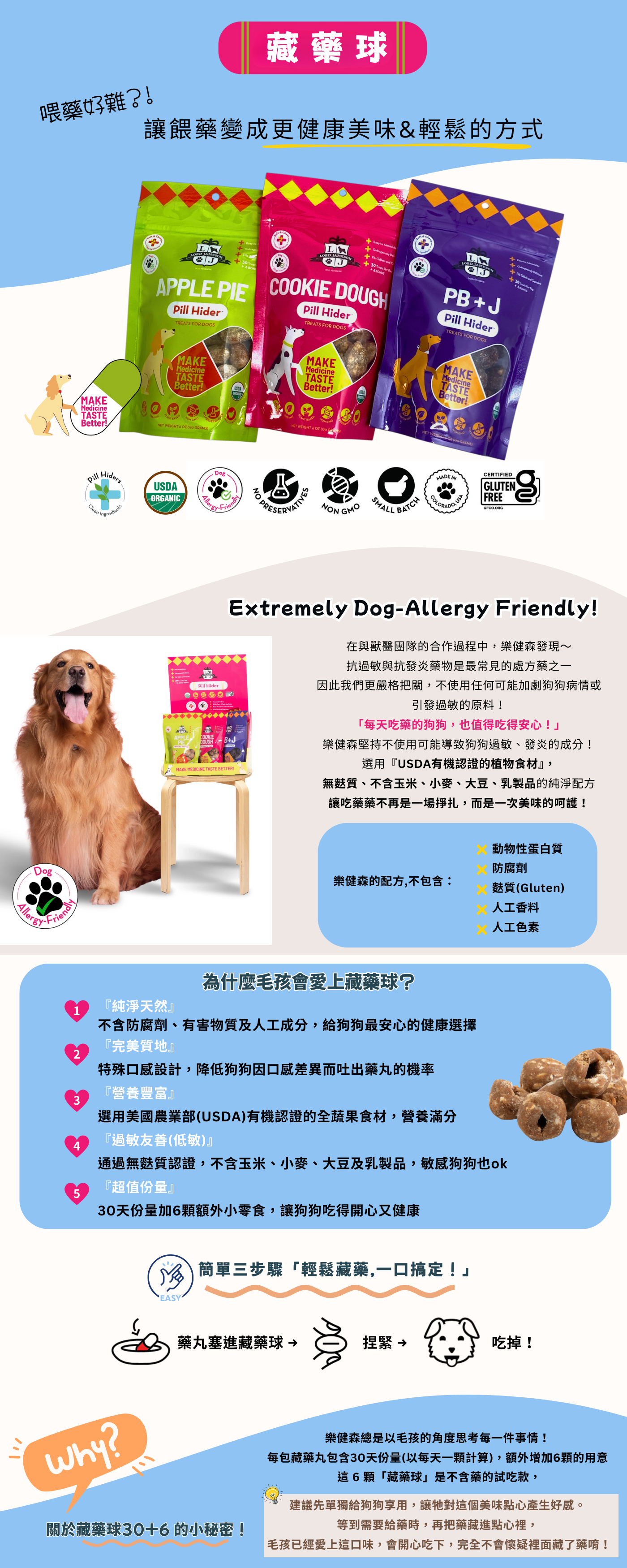 ✦ 口感混淆 ✦ 透過將真正的燕麥、花生及多種蔬果的味道和口感混合,讓狗狗難以分辨食物中的異物,降低挑出或吐出藥丸的機率!