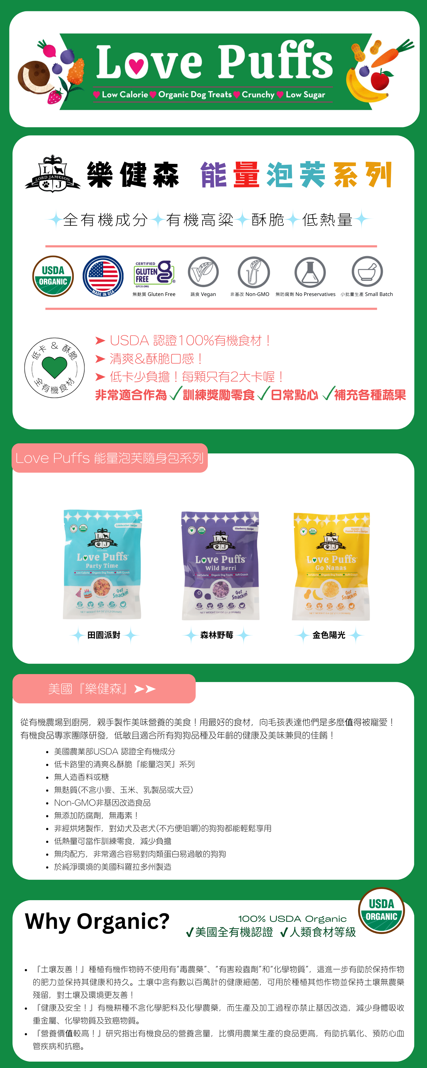 ◤使用有機高粱作為配方的基礎! 『樂健森能量泡芙』使用 100% 美國農業部認證的有機和人類級成分,包括真正的水果、蔬菜、草本和植物。