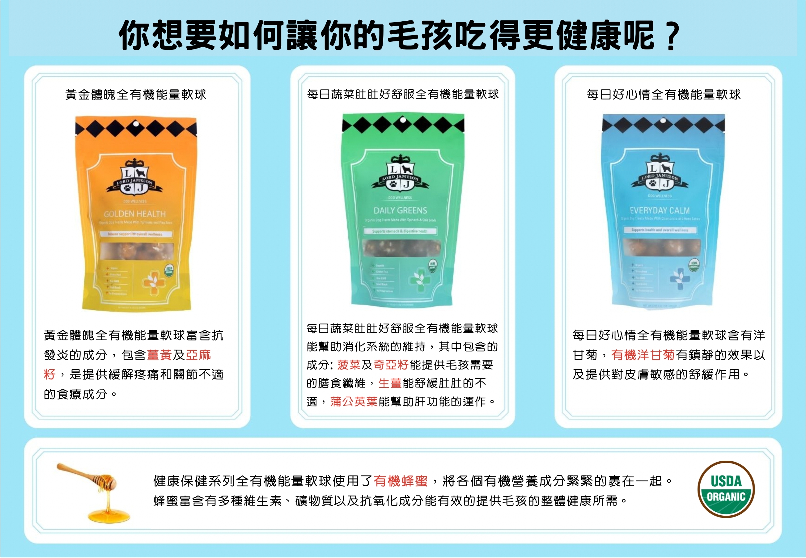USDA有機認證成份:有機洋甘菊、有機燕麥、有機蜂蜜、有機椰棗、有機花生醬、有機椰子